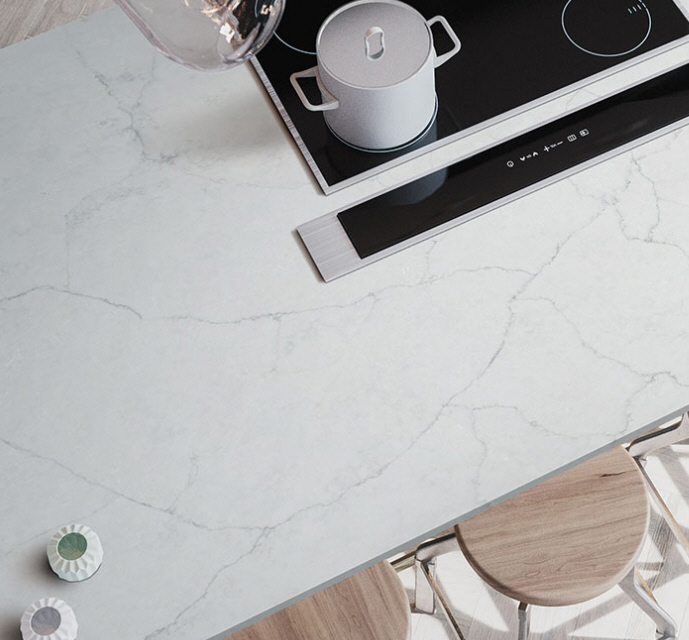 Calacatta Monaco Quartz is an elegant marble-look Calacatta quartz that features a warm white background accented by large, thin gray veining for added interest and allure. The versatile marble-like design with a polished finish will elevate an ultra-modern design or be the highlight in a traditional interior. In addition to countertops, it can also be installed for flooring and wall applications in residential and commercial spaces. The low-maintenance engineered material is nonporous and stain-resistant, so it can stand up to busy households and high traffic areas.