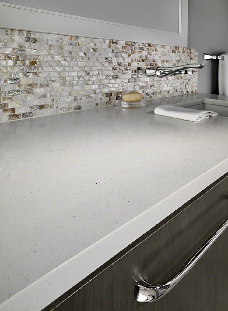 With unmatched variety and visual appeal, Stellar White Quartz features a soft white background with soft subtle gray flecks for added dimension and character. The low variation of this premium quartz makes it ideal for designs where an urban chic or modern industrial design element is desired. Durable, easy to clean, and virtually maintenance-free, it’s suitable for accent walls, floors, backsplashes, bars and tabletops; and of course, it is perfect for creating white quartz countertops that will stand the test of time.